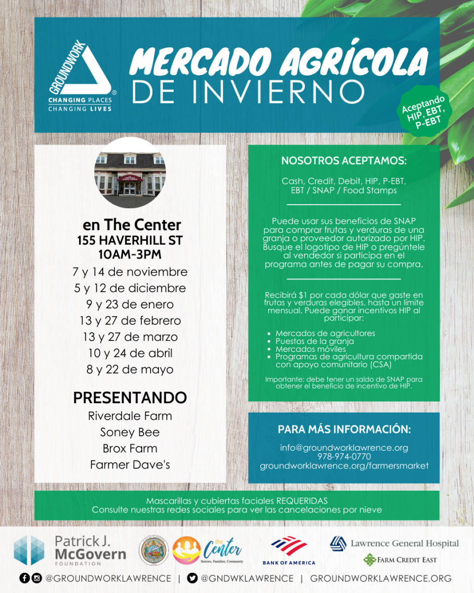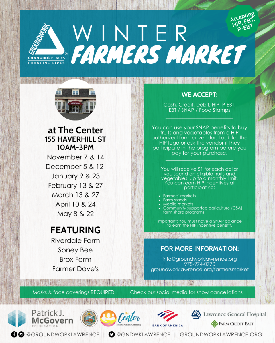 Lawrence General joins a number of local service organizations including the Merrimack Valley YMCA, The Center, the Greater Lawrence Community Action Council, and the Boys & Girls Club who have also agreed to distribute Farmer’s Market coupons to their clients in need. The $10 coupons may be distributed individually or combined to provide increased value, depending on the patients’ need, and are redeemable at any GWL Farmer’s Market through June 30, 2021. The Winter Market currently operates biweekly at The Center, 155 Haverhill St. in Lawrence and will expand to 3 weekly outdoor markets (2 in Lawrence, 1 in Methuen) on June 1. All GWL Farmer’s Markets accept cash, check, credit card, and food stamps (SNAP and HIP).