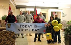 Nick was greeted by firefighters in turnout gear, a Lawrence General Hospital ambulance crew, representatives from Keith’s National Guard Unit, and a whole group of Facilities employees with balloons, a stuffed animal and a sign that read, “Today is Nick’s Day.”  As people watched from hospital windows and construction workers looked on from the roof, the little boy, holding a bouquet of Smiley Face balloons, made his way along lines of people wishing him good luck with his surgery.